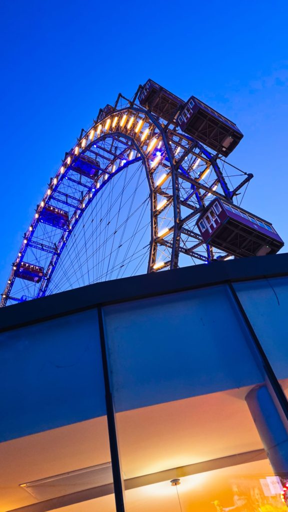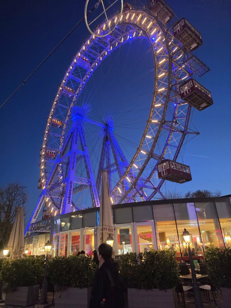 Dzień zakończyliśmy wizytą na Praterze. Przejażdżka historycznym diabelskim młynem Riesenrad przy zachodzie słońca pozwoliła podziwiać panoramę całego Wiednia.